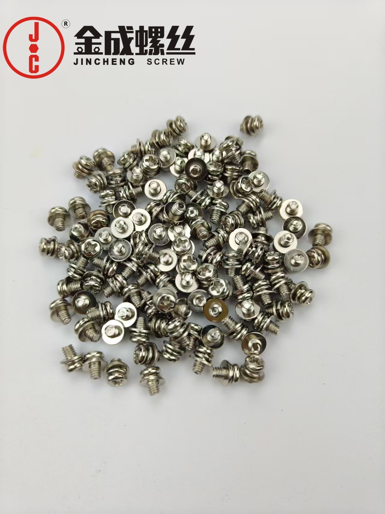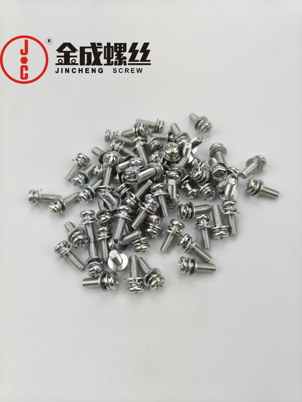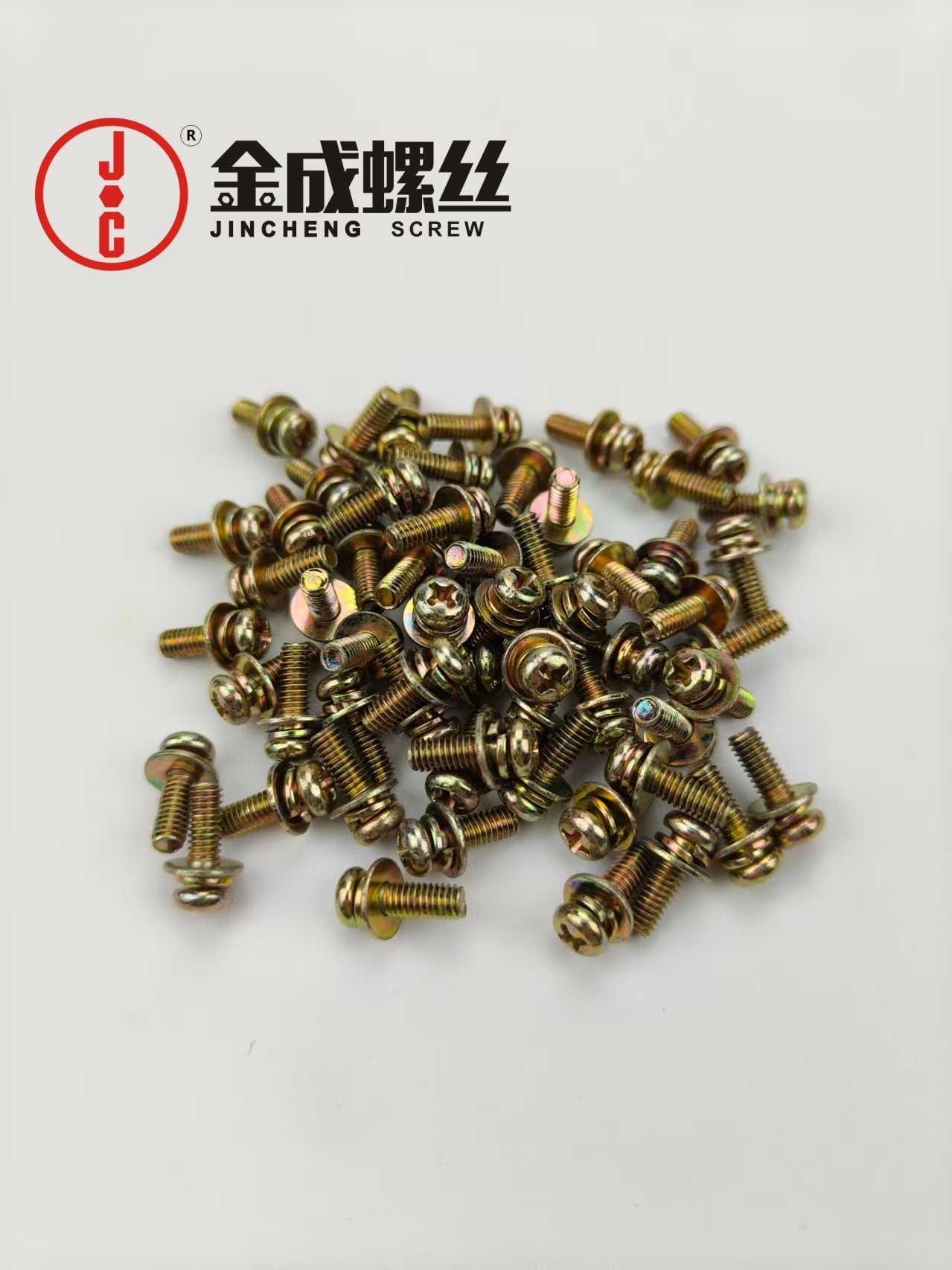 镀锌十字盘头机螺钉平弹垫组合是一种常见的机械零部件组合,主要包括十字盘头螺钉、平垫圈和弹簧垫圈三部分。十字槽盘头组合螺钉遵循国家标准,大盘头的国标号为GB9074.4,小盘头的国标号为GB9074.8。。这种组合件通常用于需要额外紧固力和防松动的应用场景,如机械设备、汽车制造、电子产品等领域。十字盘头螺钉提供紧固作用,平垫圈增加接触面积并减少对连接材料的压痕,弹簧垫圈则通过自身的弹性变形提供预紧力,防止螺钉因振动或其他因素松动。关于螺丝螺母垫圈技术与使用事宜,金成螺丝运用多年行业经验为工业客户,开启产品、设计、技术、降本等相关问题“永久免费”答疑!用心助力工业发展!做工业喜爱的螺丝服务商!欢迎随时咨询我们133 2690 6112。