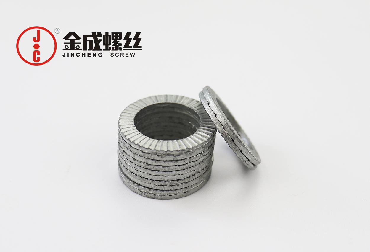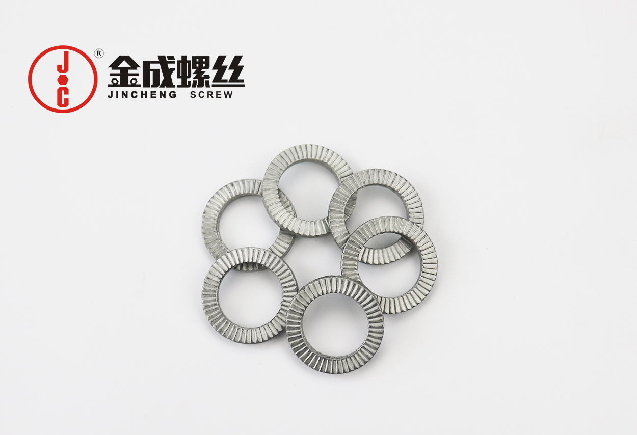 双叠自锁垫圈是由统一规格的两片垫片组成,每片的外侧带有放射状凸纹面,而内侧为斜度角更大的射状宽齿面(垫圈)。当螺栓或螺母被拧紧时,这两片垫圈之间的斜齿面相互嵌合,形成强大的摩擦力,从而提供额外的夹紧力,防止螺栓或螺母松动。一种具有双重防松功能的金属垫圈,防松垫圈又名防松垫片、自锁垫圈、自锁垫片、DIN25201防松垫圈、双叠自锁防松垫圈等。关于螺丝螺母垫圈技术与使用事宜,金成螺丝运用多年行业经验为工业客户,开启产品、设计、技术、降本等相关问题“永久免费”答疑!用心助力工业发展!做工业喜爱的螺丝服务商!欢迎随时咨询我们133 2690 6112。